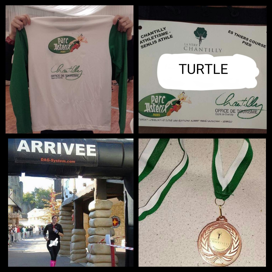 Ma première course officielle après un mois de course à pied :), c'est sa de vivre avec un Dingo lol. C'était surtout l'occasion pour nous de se retrouver dans notre Parc préféré puisque l'arrivée se fait dans le Parc Astérix. Une course nature de 5 kms vraiment très agréable malgré une sacrée côte quelques mètres après le départ, puis des chemins de forêt tantôt terre sèche tantôt du sable, c'était un parcours très sympa avec une orga très motivante tout le long du parcours et le must les encouragements de mon chéri sur la fin du parcours et jusque l'arrivée. Pour une première course je suis satisfaite de moi car je n'ai rien lâchée et j'y suis arrivée avec un temps de 40 minutes et 16 secondes.