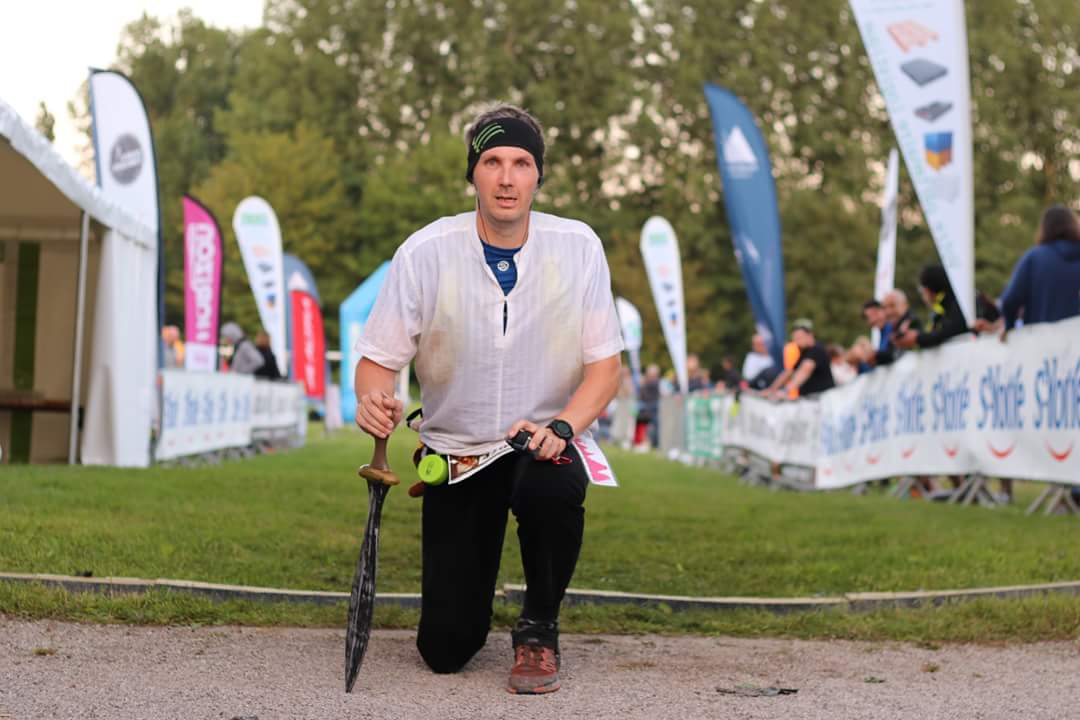maintenant je pars à l’assaut du mont de La Comté qu'on aura la chance de monter 3 fois ça me permet de profiter des paysages et discuter avec les coureurs que je croise, au passage à Magnicourt-en-Comté je me régale avec une superbe descente technique comme je les aime dans le bois-madame suivi de la belle côte bien piquante du chemin de la montagne, elle porte bien son nom lol et passage par le dernier ravito avec encore des bénévoles au top et au petit soin pour nous. Et go je repars il reste entre 8 et 9kms donc ça va aller, ça roule bien lol jusqu'à la dernière difficulté 2 magnifiques montées comme j'adore, je pars donc au combat la première passe bien dans la 1ère descente j'évite une belle chute de justesse mais bon c'est le jeu mais je repars aussi vite et hop la 2ème montée ça passe nickel et la allez je pars à fond dans la 2ème descente car je sais qu'après c'est tout schuss jusqu'à l'arrivée, je croise sur les 2 derniers kms pas mal de coureurs, je les encourage à me suivre, un dernier virage et je rentre sur le site l'arche est à moins de 100m, les spectateurs m'encouragent et me félicitent, c'est magique une arrivée comme ça, une fois la ligne d'arrivée ma quête est finie je pose le genou au sol en signe de remerciement et de respect pour le travail accompli par Sylvain et toute son équipe pour pouvoir nous offrir une aussi belle fête du trail. Cool je suis finisher et en récompense j'ai eu une belle médaille et surtout « mon précieux » et pour me ravitailler un bon hamburger, il y avait de l'attente mais pas grave c'était l'occasion d'échanger avec les amis sur notre course et cette fête, les retours sont unanimes c'est le top !!! Il y a une ambiance de dingue,musique, jeu de lumière, cracheur de feu.... et Sylvain annonce l'arrivée du dernier coureur et une haie d'honneur se met en place et le coureur franchi la ligne d'arrivée sous les confettis et un tonnerre d'applaudissement comme si il avait était le 1er,